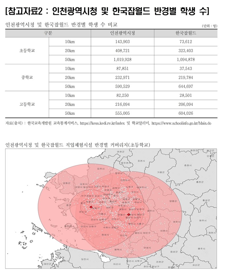 이 보고서에 따르면, 인천시청 반경 10km 내 학생 수는 약 31만 명으로, 이는 현재 국내 유일의 공공 직업체험관인 성남 ‘한국잡월드’ 배후 수요(13.9만 명)의 2.2배에 달하는 압도적인 규모다.