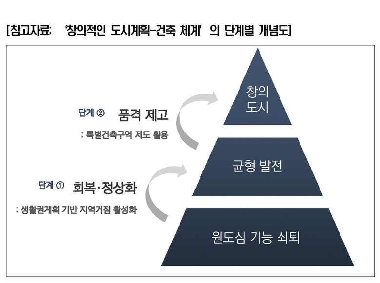 이 구상의 핵심은 ①생활권 기반 도시 재편 → ②특별건축구역을 통한 창의 설계 확장 → ③통합 운영체계 구축으로 실행력 확보라는 3단계 추진 전략이다. 생활권계획을 통해 거점·주거·상업·공공시설을 생활단위에서 재구성하고, 주민 활동 범위를 기준으로 도시를 촘촘하게 재정렬하는 방향을 제안하며, 동시에 특별건축구역을 활용해 규제 완화 중심의 기존 방식을 넘어 혁신 설계 실험·공공공간 개선·경관 창출이 가능한 도시개발 플랫폼을 구축한다는 구상이다.
