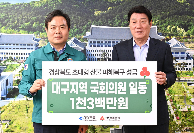 이번 성금은 산불 피해 이재민들의 아픔을 치유하고 빠른 일상 회복을 바라는 마음으로 대구지역 국회의원 13명이 뜻을 모아 모금해 마련한 것으로, 강대식 국회의원이 대표로 경북도청을 방문해 전달했다.