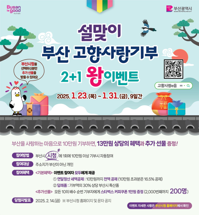 '설맞이 부산고향사랑기부 2+1 왕 이벤트'는 설 명절을 앞두고 오늘(23일)부터 1월 31일까지 고향 '부산광역시(시청)'에 기부하는 사람들에게 '3가지 혜택'을 제공하는 행사다.