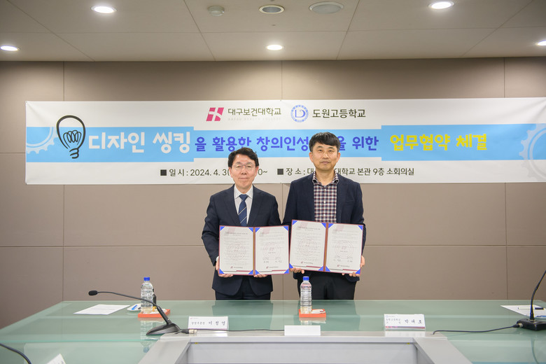 [대구 세계타임즈=한윤석 기자] 도원고등학교(교장 박대호)는 지난 4월 3일(수) 대구보건대학교(총장 남성희)와 ‘디자인 씽킹을 활용한 창의인성 교육 지원을 위한 업무협약’을 체결하였다.