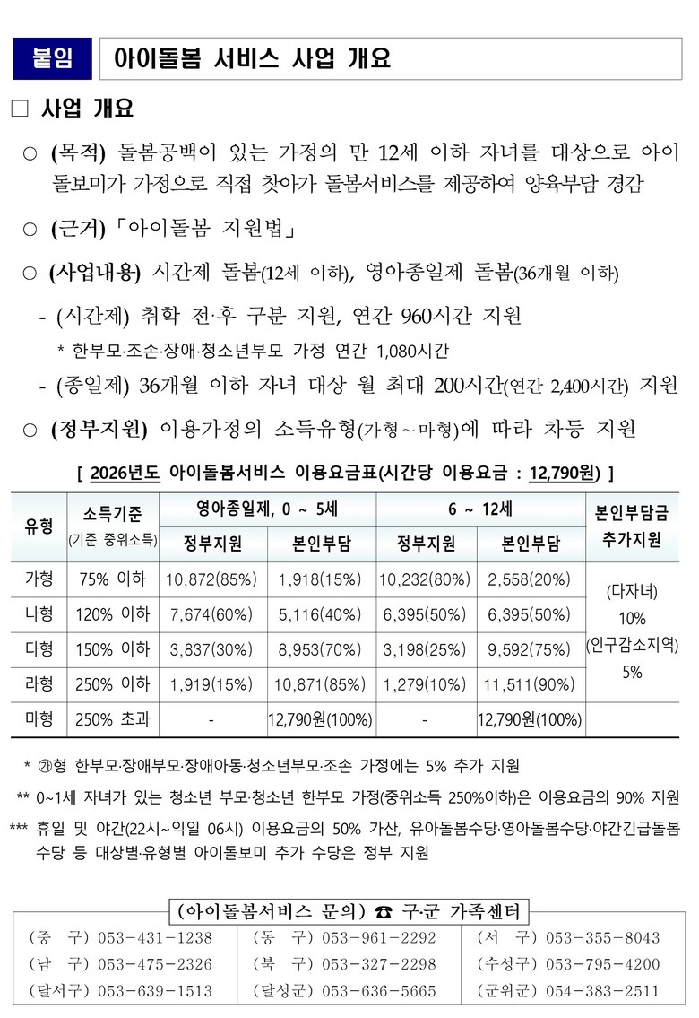 박윤희 대구광역시 청년여성교육국장은 “설 연휴 기간에도 아이들이 안전하고 따뜻한 돌봄을 받을 수 있도록 평일요금으로 서비스를 정상운영하고, 올해 확대되는 아이돌봄서비스를 통해 부모님들이 안심하고 일과 가정을 병행할 수 있도록 적극 지원하겠다”고 말했다.