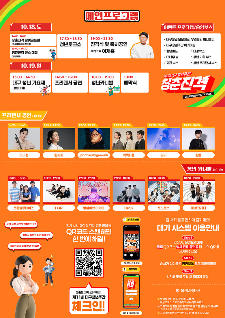 ▸ 키오스크 체크인(QR팔찌) 도입으로 편리하고 스마트한 축제 운영 [대구 세계타임즈=한윤석 기자] 대구광역시는 10월 18일(토)부터 19일(일)까지 이틀간, 동성로 일대(CGV대구한일~동성로28아트스퀘어~구 중앙파출소)에서 ‘2025 대구청년주간’을 개최한다.
