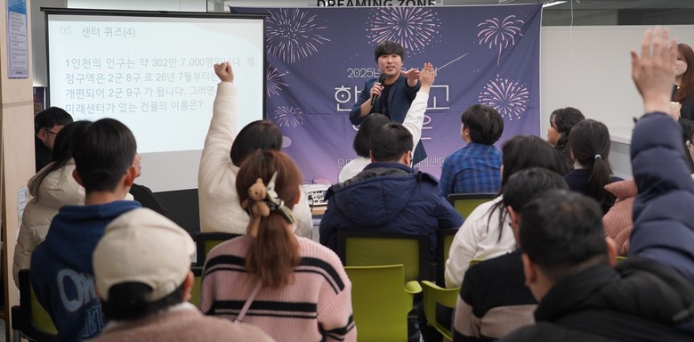 | ▲ (사진 오른쪽) 인천시청년미래센터가 지난해 말 마련한 송년모임에서 고립은둔청년들이 퀴즈 프로그램에 참여하고 있다. |