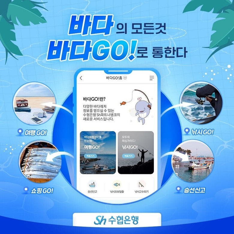바다GO!는 수협은행이 해양수산부, 한국어촌어항공단, ㈜애쓰지마 등과 손잡고 콘텐츠 협력 및 제휴를 통해 새롭게 선보이는 비금융 서비스다.