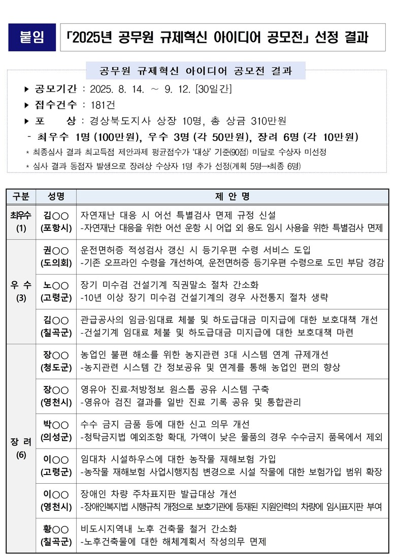 경북도는 지난해 8월 공무원 공모전을 시작으로 11월에는 도민 공모전을 개최해 아이디어를 받아 12월 규제개혁위원회를 열어 수상자 등을 최종심의·확정했다.