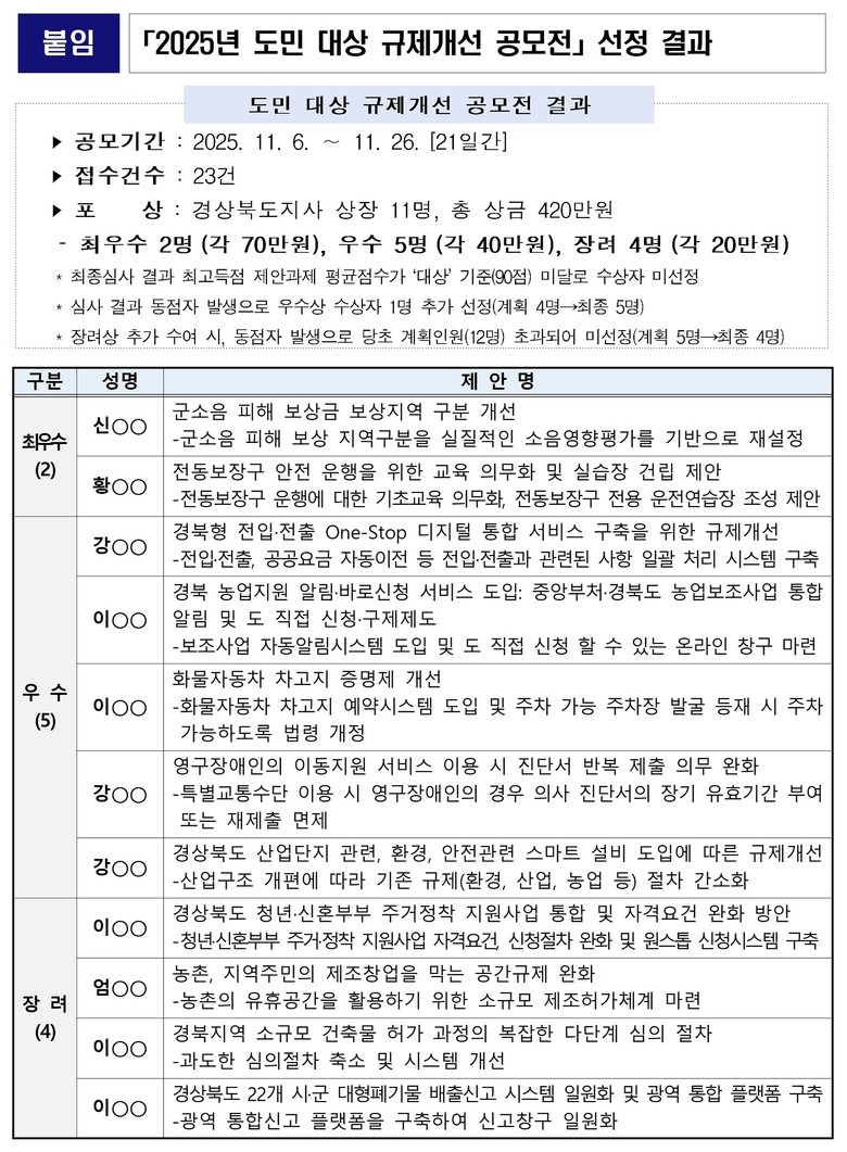 경북도는 지난해 8월 공무원 공모전을 시작으로 11월에는 도민 공모전을 개최해 아이디어를 받아 12월 규제개혁위원회를 열어 수상자 등을 최종심의·확정했다.