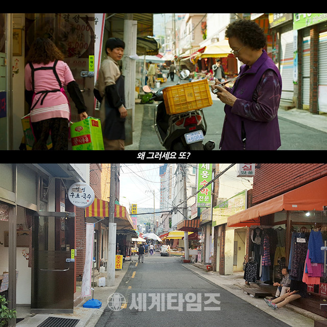 영화 '아이 캔 스피크' 캐릭터 영상에 극 중 봉원시장, 실제 부산 연산시장의 경성 구포국수 앞에서 나문희가 디지털 카메라로 무언가를 촬영하는 장면이 공개됐다.