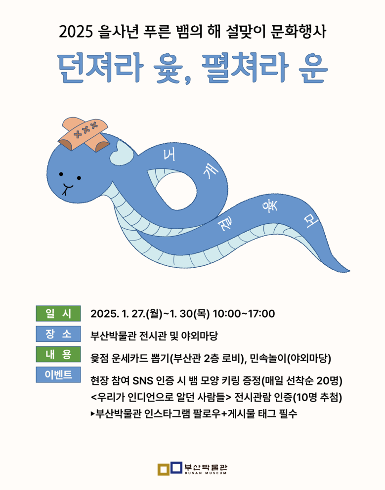 정은우 부산시립박물관장은 “이번 설맞이 문화행사는 온 가족이 함께 우리의 전통문화를 체험하고 특별한 추억을 만들 수 있는 좋은 기회”라며, “앞으로도 부산박물관은 시민들이 일상에서 문화유산을 쉽게 접할 수 있는 열린 문화공간 역할을 지속적으로 확대해 나가겠다”라고 전했다.