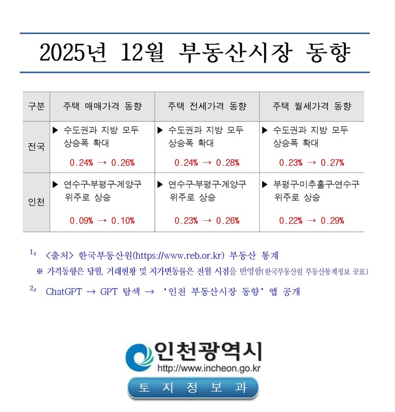 - 매물 감소 및 선호 지역에 대한 임차 수요 지속으로 전‧월세 상승세 - [인천 세계타임즈=심하린 기자] 인천광역시(시장 유정복)는 인천 지역의 2025년 12월 주택 매매가격이 3개월 연속 상승세를 이어갔으며, 전‧월세가격도 오름세를 지속한 것으로 나타났다고 밝혔다.