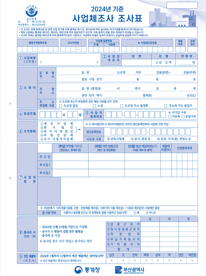 조사 대상은 2024년 12월 말 기준으로 산업활동을 수행했거나, 조사일 현재 부산시에서 산업활동을 수행하고 있는 모든 사업체다.