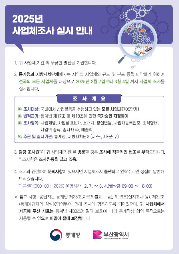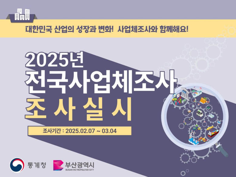 [부산 세계타임즈=이용우 기자] 부산시(시장 박형준)는 오늘(7일)부터 3월 4일까지 부산에서 산업활동을 수행하고 있는 모든 사업체를 대상으로 「2025년(2024년 기준) 사업체조사」를 실시한다고 밝혔다.