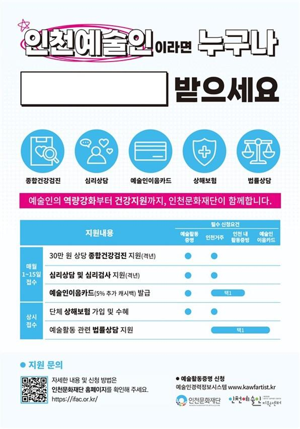○ 예술인 창작 환경 개선을 위한 복지 안전망 구축 목표 [인천 세계타임즈=심하린 기자] 인천문화재단(대표이사 이종관, 이하 재단)이 지역 예술인의 복지 향상을 위한 종합 지원을 추진한다. 예술인의 신체적·정신적 건강은 물론 창작 과정에서 겪는 법적 권리 보호까지 아우르는 종합 지원 체계로 운영한다. 주요 지원 항목은 ▲종합건강검진 ▲전문 심리상담 및 검사 ▲법률상담 분야다.