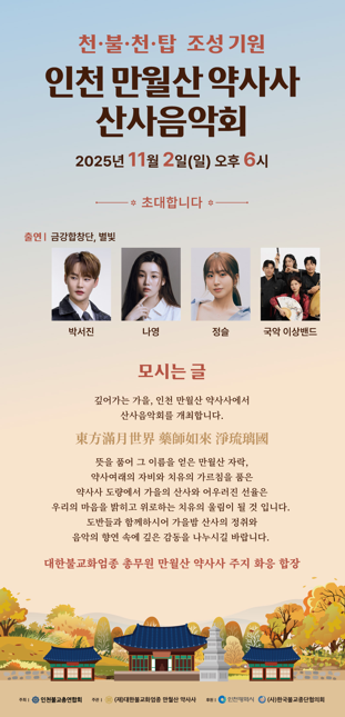 이번 음악회는 인천시가 후원하고 인천불교총연합회가 주최, 약사사가 주관하는 가을 대표 문화행사로, 도심 속 사찰을 문화무대로 확장해 시민이 함께 즐길 수 있는 열린 힐링 축제로 기획됐다.