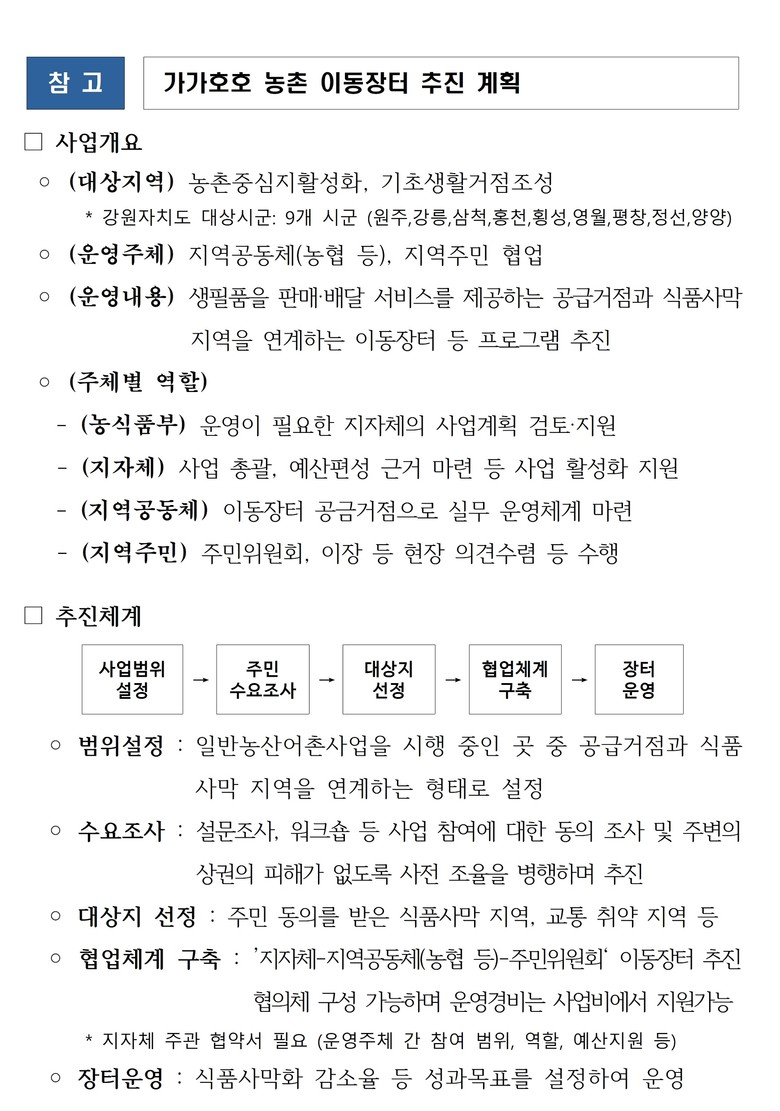 ‘가가호호 농촌 이동장터’ 운영은 농협, 사회적기업 등 지역 공동체와 주민 협업으로 추진되며 이동식 차량을 이용한 이동형 서비스부터, 읍‧면소재지 농협하나로마트 등과 연계, 주문받은 물품을 마을까지 배달하는 주문배달형 서비스까지 다양한 사업 유형 중 지역에 맞는 것을 시군 자율적으로 선정하여 운영할 수 있다.