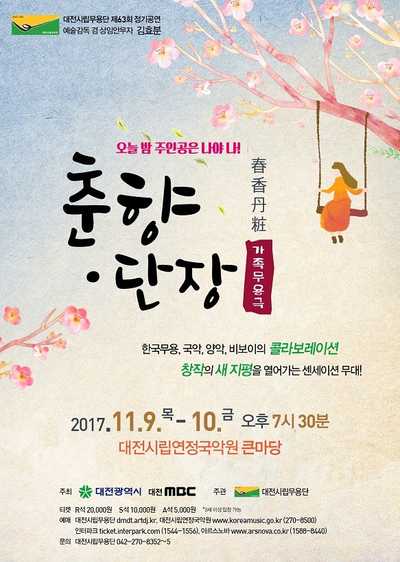 대전시립무용단이 우리 민족의 대표적인 고전소설 ‘춘향전’을 현시대를 배경으로 국악과 판소리, 서양음악과 K-pop이 어우러지는 콜라보레이션 작품으로 제63회 정기공연 ‘춘향 · 단장 春香· 丹粧’을 11월 9일과 10일 19시 30분 대전시립연정국악원 큰마당에서 공연한다.