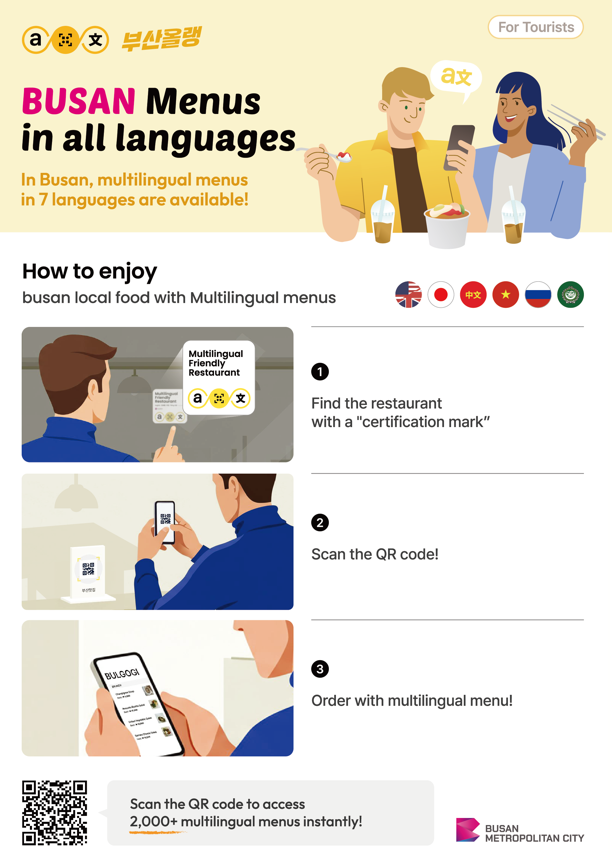 ‘부산형 음식점 디지털 외국어메뉴판 지원사업’은 외국인 관광객과 내외국인 주민에게 언어 장벽 없는 외식 환경을 제공하기 위해 ▲전국 지자체 최초로 추진한 인공지능(AI) 기반 번역 메뉴판 제작 전용 플랫폼 ‘부산올랭’을 중심으로, ▲2천15개 음식점 외국어 메뉴판 지원 ▲외국인 친화 인증 스티커 부착 ▲큐알(QR) 안내판 보급 등 외식업계의 디지털 전환을 실현한 대표적 사례다.