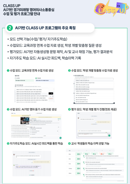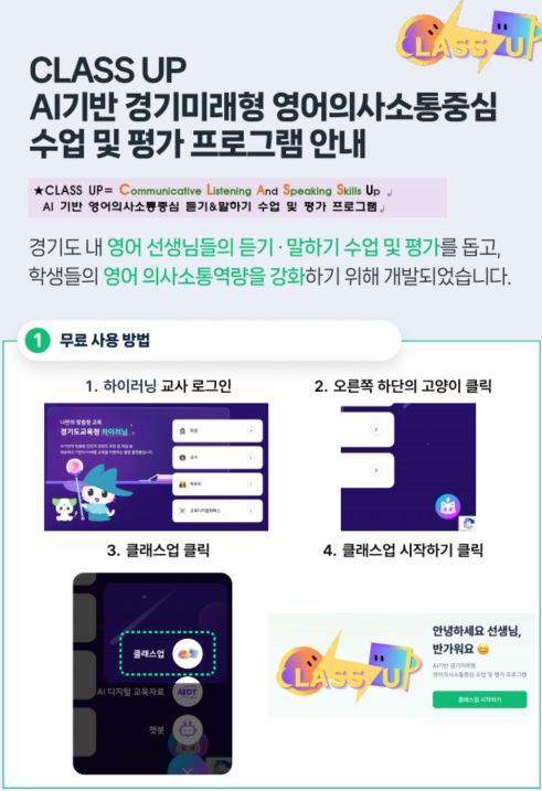[경기도 세계타임즈=송민수 기자] 경기도교육청(교육감 임태희)이 학생의 영어 의사소통 역량 강화와 교원의 교수·평가를 지원하는 인공지능(AI) 기반 경기 미래형 영어의사소통 중심 수업·평가 모형 ‘클래스 업(CLASS UP)’을 도내 모든 학교에 보급한다.