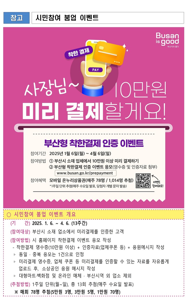 1월 6일부터 4월 6일까지 13주간 진행되는 ‘착한결제 인증 이벤트’는 부산시 소재 업소에서 10만 원 이상 미리 결제한 고객을 대상으로 한다. 참여를 원하는 시민은 시 누리집(www.busan.go.kr/prepayment)에 미리 결제 영수증과 업체 쿠폰 등 인증자료를 게시하고, 소상공인을 응원하는 메시지를 작성하면 된다.