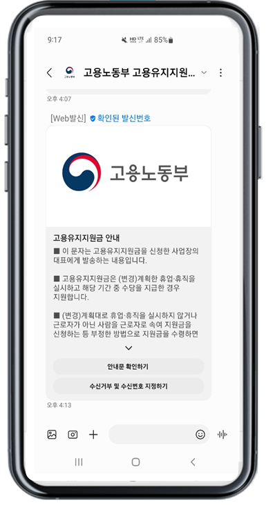 현재 고용노동부는 정부 기관 최초로 고용유지지원금 안내문이 담긴 공인알림문자를 안심마크가 포함된 RCS 방식으로 근로자와 사업주에게 시범 발송하고 있다.