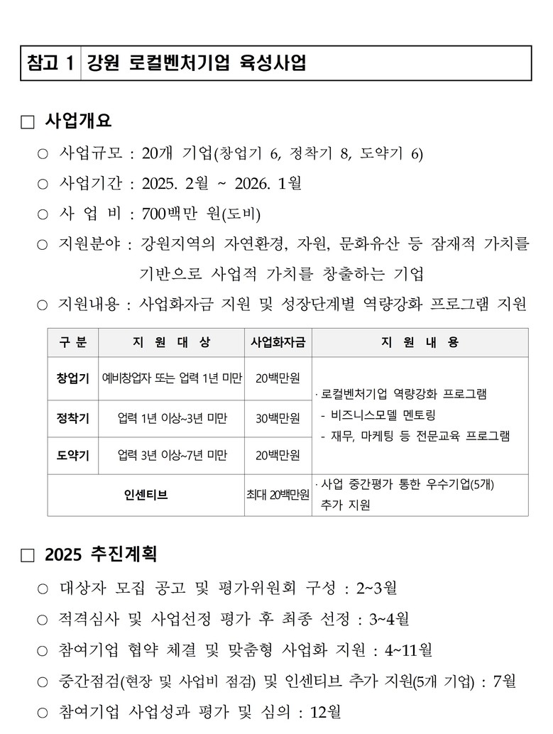 강원 로컬벤처기업 육성사업은 지역의 자연적·문화적 특성과 혁신적인 아이디어를 결합하여 경제적 가치를 창출하는 로컬벤처기업을 대상으로 사업화 자금과 전문 분야별 역량 강화 교육프로그램 등을 지원하는 사업이다.