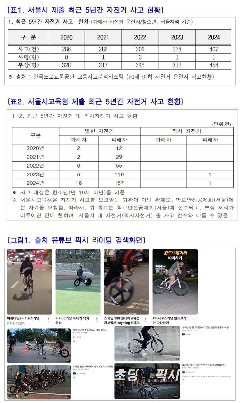 또한 “서울시와 서울시교육청이 제공하는 자전거 안전교육 자료 및 학생안전 매뉴얼을 점검한 결과, 픽시자전거의 위험성을 언급한 항목은 일부 존재하지만, 픽시자전거의 법적 지위, 인도 주행 금지 등의 이용 수칙, 보호장구 착용 의무 등 핵심 내용은 누락돼 있었다”며 “심지어 서울시교육청의 2024년 학생안전 매뉴얼에는 픽시자전거에 대한 언급조차 없는 상황”이라고 지적했다.