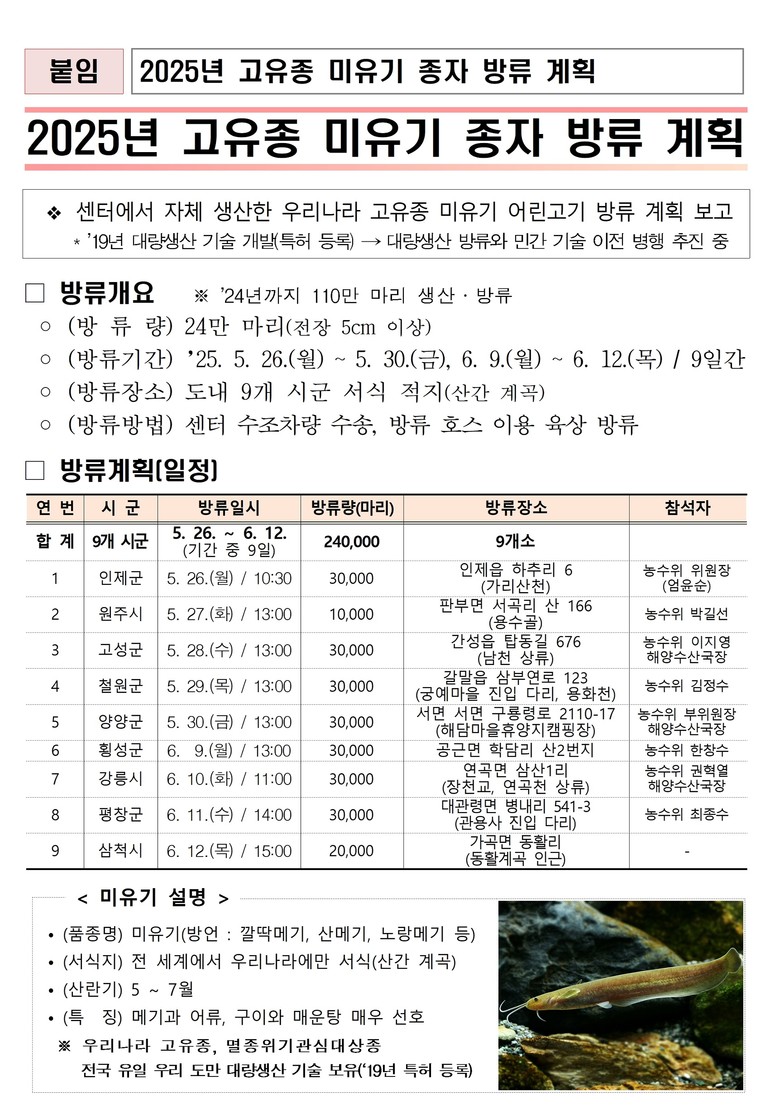 이동희 강원특별자치도 해양수산국장은 “올해는 역대 최대규모로 미유기를 대량 생산하는 성과를 거두었다”며, “이를 시작으로, 어업인 소득품종인 동자개, 대농갱이, 다슬기 등 총 130만 마리 이상을 방류할 계획”이라고 밝혔다.