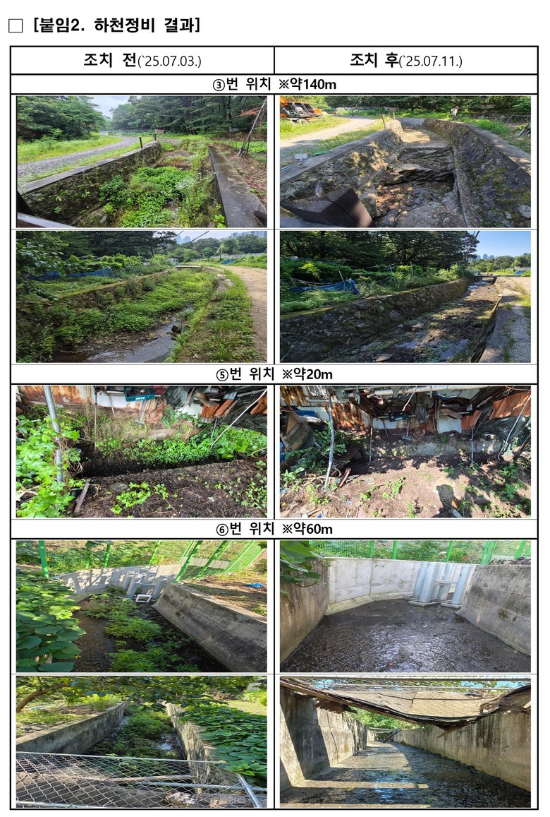 금년에는 이를 사전 예방하기 위해 서울주택도시개발공사(SH, 사장 황상하)와 강남구가 협업하여 6.28 부터 7.8 까지 13일간 벌개제근 및 예초작업 3,400m2, 개수로 준설 및 운반처리 620m3, 폐기물 50m3를 처리하였다.