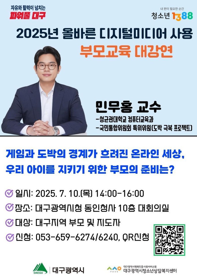 이번 강연은 일반 시민과 청소년 자녀를 둔 부모 등을 대상으로 대구광역시 청소년상담복지센터 홈페이지(1388.daeguyouth.net) 온라인 QR코드 또는 전화(053-659-6274)로 사전 신청을 받는다.