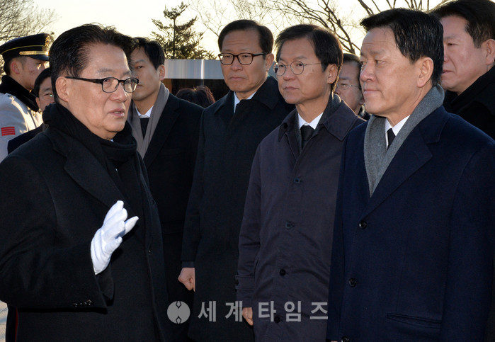 16일 오전 서울 동작구 국립서울현충원에서 국민의당 박지원(왼쪽) 대표가 당 지도부와 故 김영삼 전 대통령 묘역 참배를 마치고 대화하고 있다. 왼쪽부터 박 대표, 문병호 최고위원, 천정배 전 대표, 주승용 원내대표. 2017.01.16
