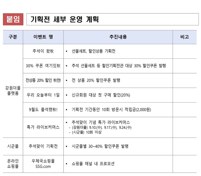특히, 도내 18개 시군몰에서도 30~40%의 할인 기획전이 진행되며, 강원더몰 자체 라이브커머스 채널을 통해서는 특가 라이브커머스가 9월 10일, 17일, 24일 3회에 걸쳐 진행될 예정이다.