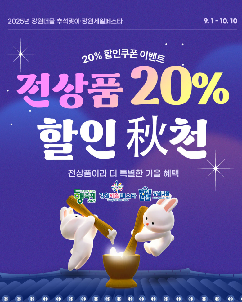 - 최대 66%할인, 30% 할인쿠폰 등- [강원도 세계타임즈=김민석 기자] 강원특별자치도(도지사 김진태)의 대표 온라인 쇼핑몰 ‘강원더몰’(www.gwdmall.kr)이 2025년 추석을 맞아 ‘동행축제· 강원세일축제(페스타)’와 함께 9월 1일부터 10월 10일까지 40일간 ‘추석맞이 기획전’을 개최한다. 이번 기획전은 입점 기업의 매출 확대와 소비자의 합리적인 명절 쇼핑을 지원하기 위해 기획됐다.
