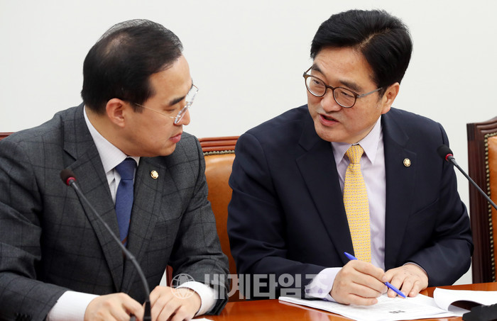 우원식(오른쪽) 더불어민주당 원내대표와 박홍근 원내수석부대표가 12일 오전 서울 영등포구 여의도 국회 더불어민주당 원내대표회의실에서 진행된 더불어민주당 원내대책회의에서 이야기를 나누고 있다. 2017.12.12.