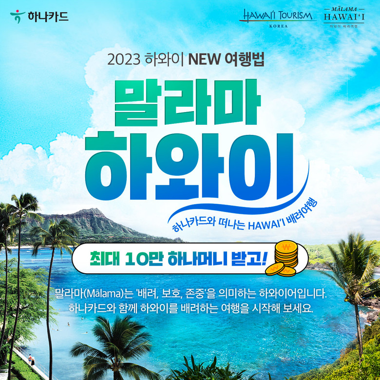 하나카드 마케팅추진부 남윤채 대리는 “하와이 여행을 계획하고 계시는 손님을 위해 서비스의 편리함과 더 좋은 혜택을 드리기 위해 하와이 관광청과 이벤트 기획에 많은 정성을 들였다” 며, “하와이 본래의 아름다움 모습을 지켜가면서 하와이에서 여유 있고 낭만 있는 여행을 즐기시길 바란다”고 전했다.