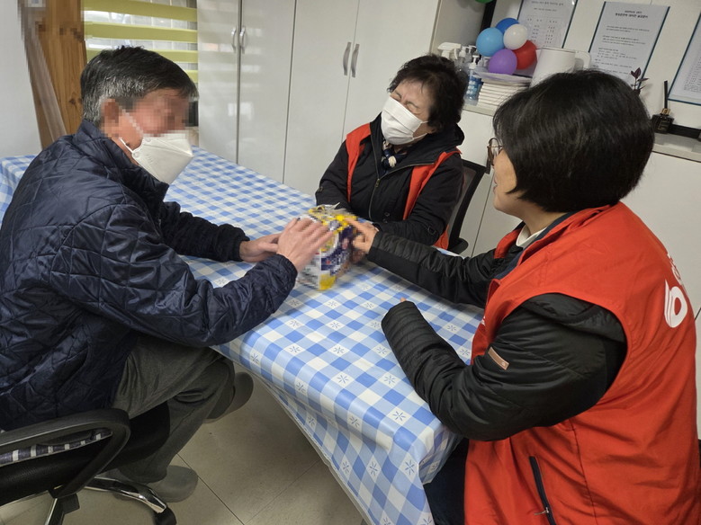 | ▲ 어르신과 함께 있는 돌봄봉사단 모습 |