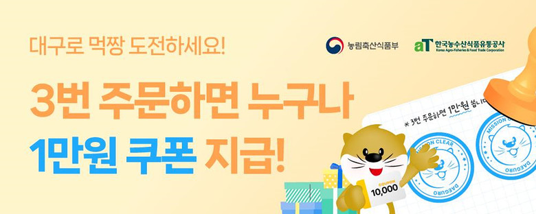 참여 방법은 별도 신청 없이 ‘대구로’에서 음식배달·포장 주문 2만 원 이상(배달료 포함) 3회 결제 시, 익월 1일에 1만 원 쿠폰이 자동으로 지급되는 방식이며, 해당 쿠폰은 ‘대구로’에서 2만 원 이상 결제 시 사용 가능하다.