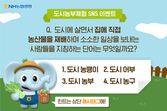 '도시농부체험' 이란 NH농협생명이 자사 페이스북과 인스타그램을 통해 모집한 고객에게 화분, 받침, 배양토, 씨앗 4종 등이 포함된 텃밭세트를 제공하고, 체험 고객이 직접 작물을 키워 성장과정을 공유하는 이벤트다.