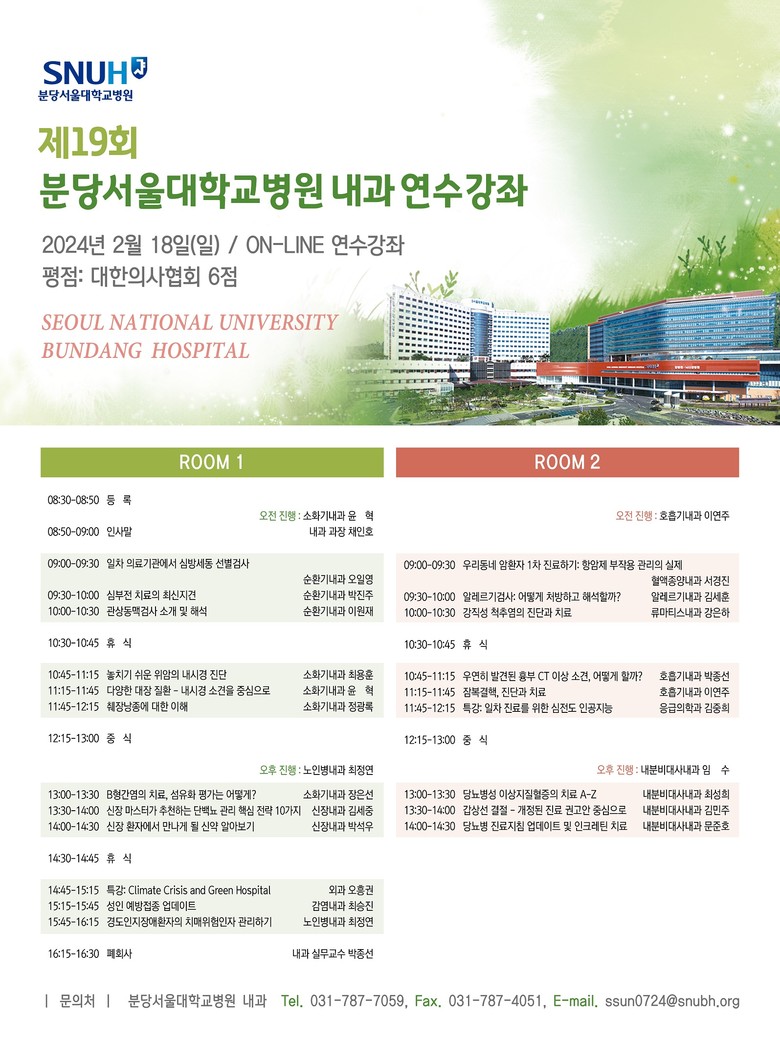 연수강좌는 2월 13일(화) 자정까지 분당서울대병원 내과 연수강좌 홈페이지에서 사전등록을 통해 참석할 수 있다.
