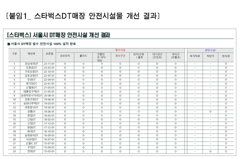 그 결과, 서울시 내 스타벅스 드라이브스루 전 지점(23곳)은 경보장치, 차량 추락 방지용 볼라드, 바닥재 보강, 경사구간 점자블록 등 필수 안전시설을 100% 설치 완료했으며, 일부 매장에서는 반사경 개선 등 권장시설까지 자발적으로 확대 적용하였다.