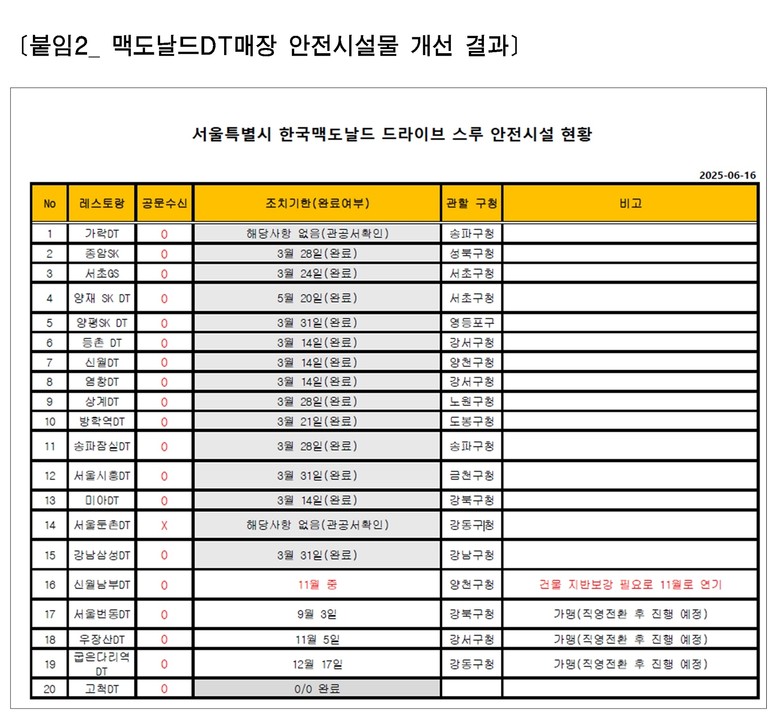맥도날드 역시 서울시 내 20여 개 매장 중 직영점과 행정 요청 대상 매장을 중심으로 대부분의 시설 보강을 3~5월 중 완료했으며, 일부 가맹 매장은 직영 전환 후 개선이 예정되어 있다. 건축 구조상 일정 조정이 불가피한 일부 사례를 제외하면, 사실상 모든 매장에 대한 조치가 마무리된 상태다.