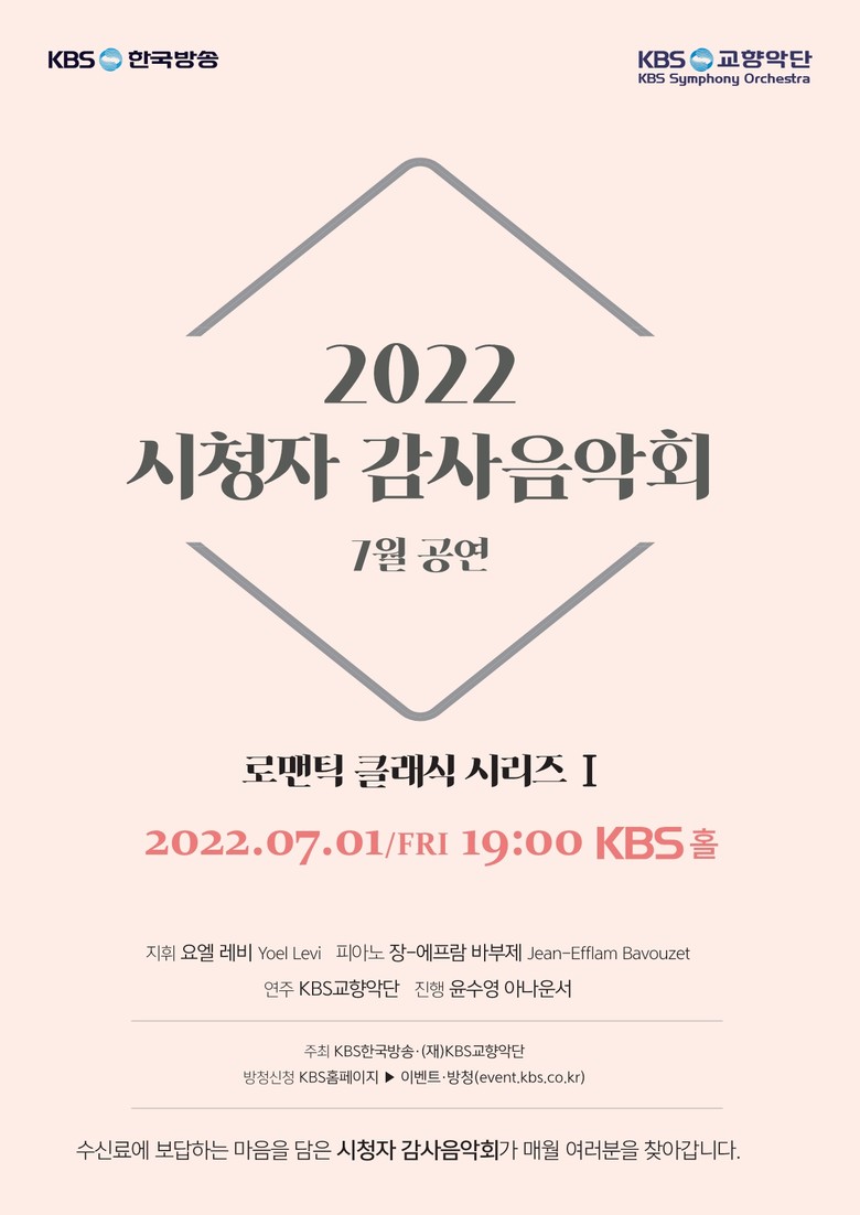 오는 7월 1일에는 ‘로맨틱 클래식 시리즈Ⅰ’을 부제로 요엘 레비 지휘, 피아니스트 장-에프람 바부제 협연, KBS교향악단이 연주하는 7월의 감사음악회를 연다.