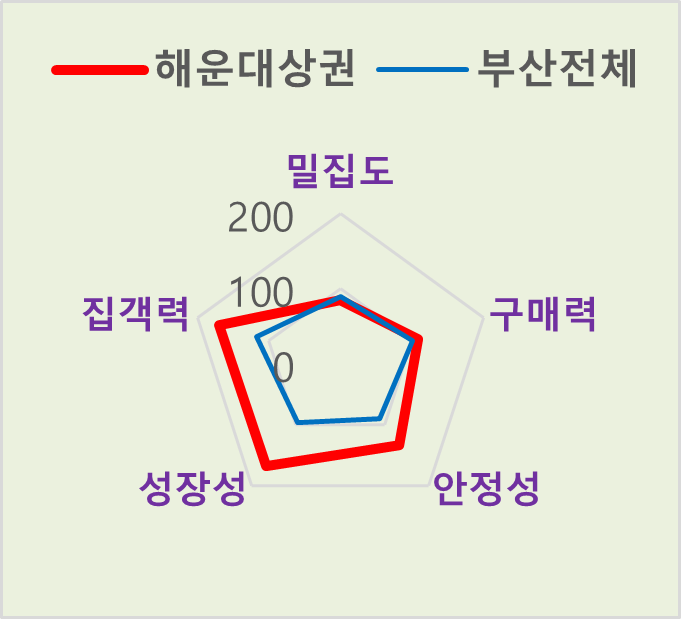 해운대 상권은 부산 전체 평균 대비 모든 항목에서 우위를 점했으며 특히 집객력, 성장성, 안정성 항목에서 높은 점수를 받아 1등급 상권으로 분류됐다.