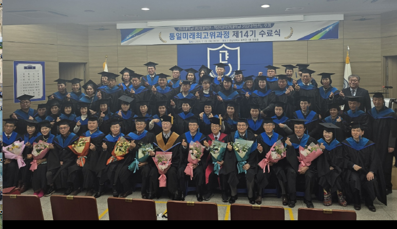 이날 『통일 미래 최고위 과정』제14기 후기 수료식에 남길우 회장 (석좌교수) 행정대학원 윤태영 원장, 이정혜 보훈 방송 편집국장. 보훈처 사무국장, 광포횟집 정선이 대표 등 내빈들과 강 명상 회장 (총학생회) 대학원 동기들이 참석한 가운데 수료식이 거행됐다.