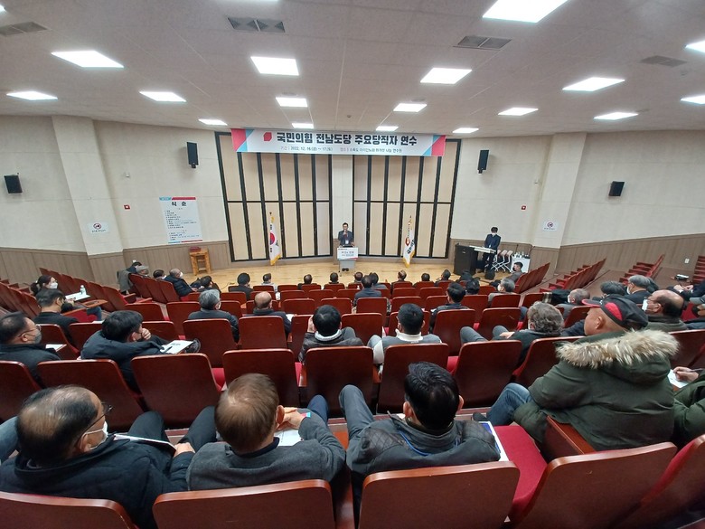 19일 국민의힘 전남도당에 따르면 주요 당직자들의 역량 개발과 화합을 위해 열린 당원 연수에는 김화진 도당위원장과 당협위원장 등 당직자 70여 명이 참석했다.(사진 국민의힘 제공)