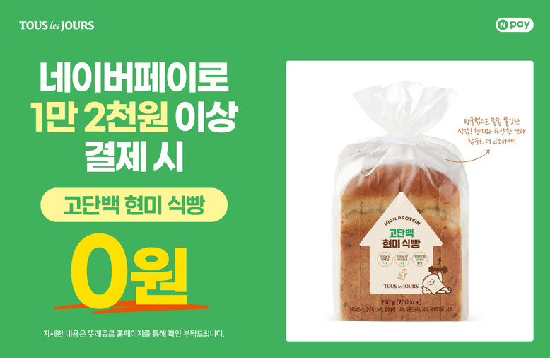 뚜레쥬르 매장에서 네이버페이로 1만 2천 원 이상 결제 시 ‘고단백 현미 식빵’ 증정