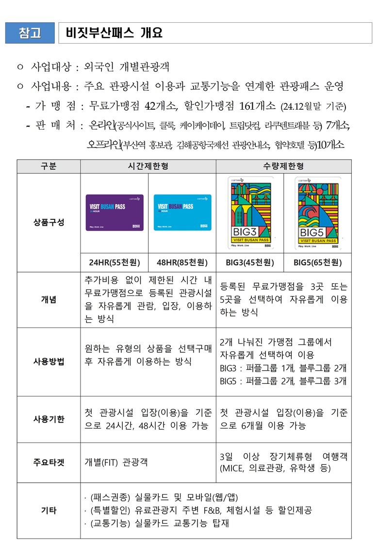 '비짓부산패스'는 외국인 개별 관광객을 주요 타깃으로 한 자유이용권형 관광패스로, 별도 입장권을 구매할 필요 없이 패스를 통해 검증된 유명 관광시설을 가성비 있게 즐길 수 있어 시간과 비용을 일석이조로 절약할 수 있는 상품이다.