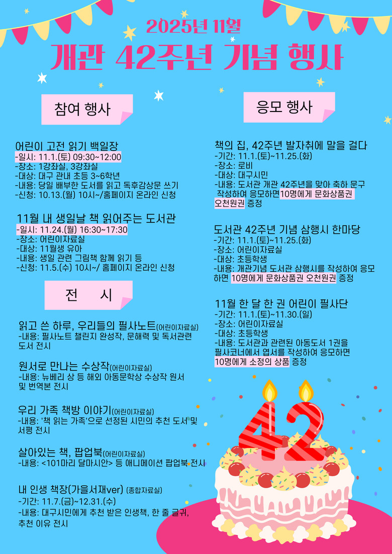 주요 행사로는 ▲42주년을 축하하는 문구를 작성하는 ‘책의 집, 42주년 발자취에 말을 걸다’, ▲도서관과 관련된 삼행시를 공모하는 ‘도서관 42주년 기념 삼행시 한마당’ 등을 11월 25일까지 실시한다.