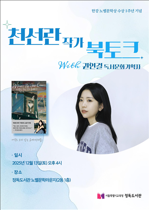 12월 1일(월)에는 『안녕이라 그랬어』의 김애란 작가, 12월 13일(토)에는 『아무도 오지 않는 곳에서』의 천선란 작가가 참여해 작품 창작 과정과 작품에 대한 생각을 공유하고, 참여자들과 대화를 나눌 예정이다.