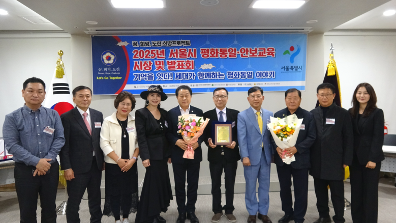 | ▲ 지난 10월 25일 서울시의회 별관 제2대회의실에서 열린 ‘2025 서울시 평화통일ㆍ안보교육 시상 및 발표회’에 참석한 김용호 시의원(왼쪽 네 번째)이 서울시상점가ㆍ전통시장연합회(회장 반재선) 및 각 구 상점가 회장들에게 단체상과 개인상을 수여하고 기념촬영을 하고 있다 |