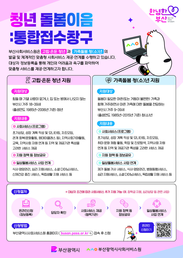 ◈ 고립은둔 청년과 가족돌봄 청(소)년은 부산사회서비스원 누리집(busan.pass.or.kr)을 통해 사회서비스 지원 요청할 수 있으며 바로가기 QR코드를 통해서도 접속 신청 가능 [부산 세계타임즈=이용우 기자] 부산광역시사회서비스원(원장 유규원)은 부산광역시(시장 박형준)와 함께, 부산의 고립·은둔 청년과 가족돌봄 청(소)년 대상으로 “맞춤형 사회서비스 제공 및 연계 지원을 위한 청년 돌봄이음 사업”을 실시하고 체계적인 대상자 발굴 및 서비스 신청 등을 위한 통합접수창구를 지역 내 최초 개설 및 상시 운영한다.